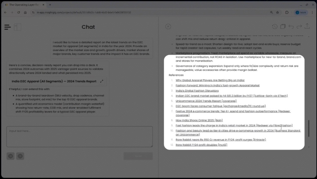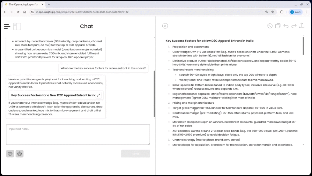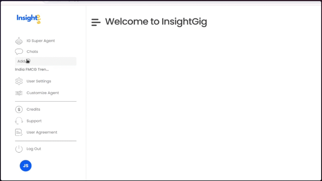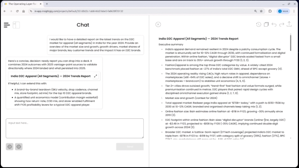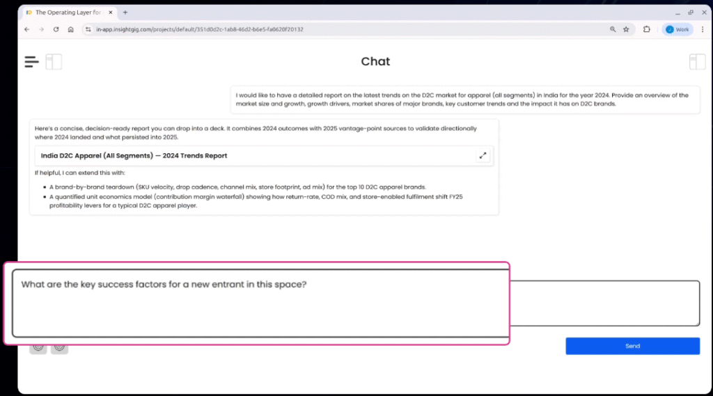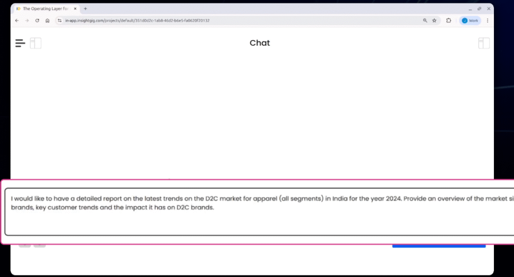 Open your workspace inside InsightGig’s Operating Layer. Initiate a new conversation in your dedicated chat environment for research queries.